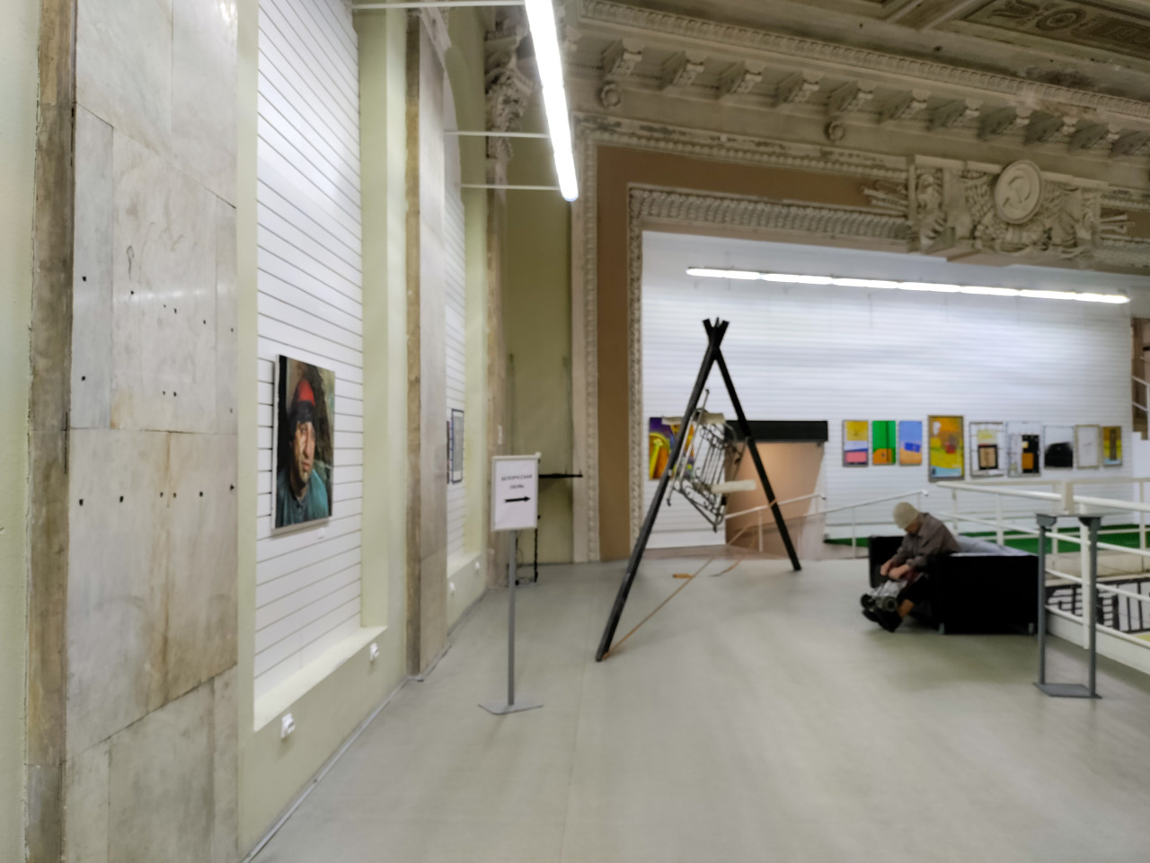 На изображении виден участок выставочного зала с портретом человека на стене и элементами инсталляции — металлической конструкцией на треноге. На переднем плане посетитель сидит на диване, а в глубине зала — ряды белых стендов с другими произведениями. Архитектурное оформление зала с лепниной и барельефом серпа и молота указывает на советское происхождение здания. Фото можно использовать для иллюстрации современных выставок, культурных мероприятий и архитектурных объектов советского периода.