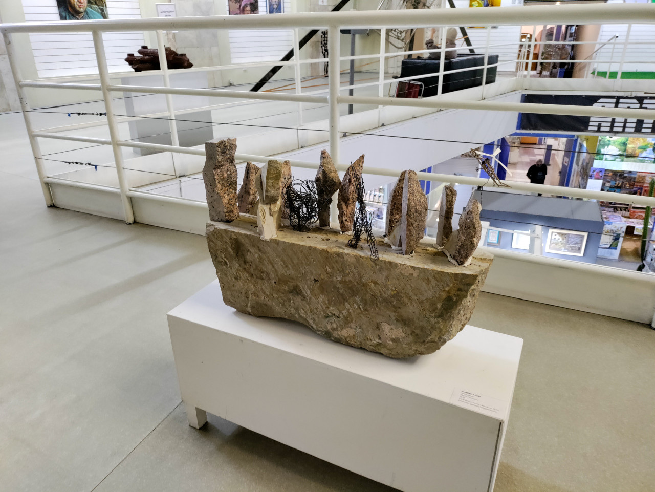 На фото изображён арт-объект из природного камня и металлической проволоки, установленный на белом постаменте в выставочном зале ДК Крупской. Композиция состоит из фрагментов камня, вертикально вставленных в основу, между которыми переплетены проволочные элементы. На заднем плане видна экспозиция с другими современными скульптурами и перила балкона. Работа представляет собой пример современного абстрактного искусства, объединяющего природные и индустриальные материалы.