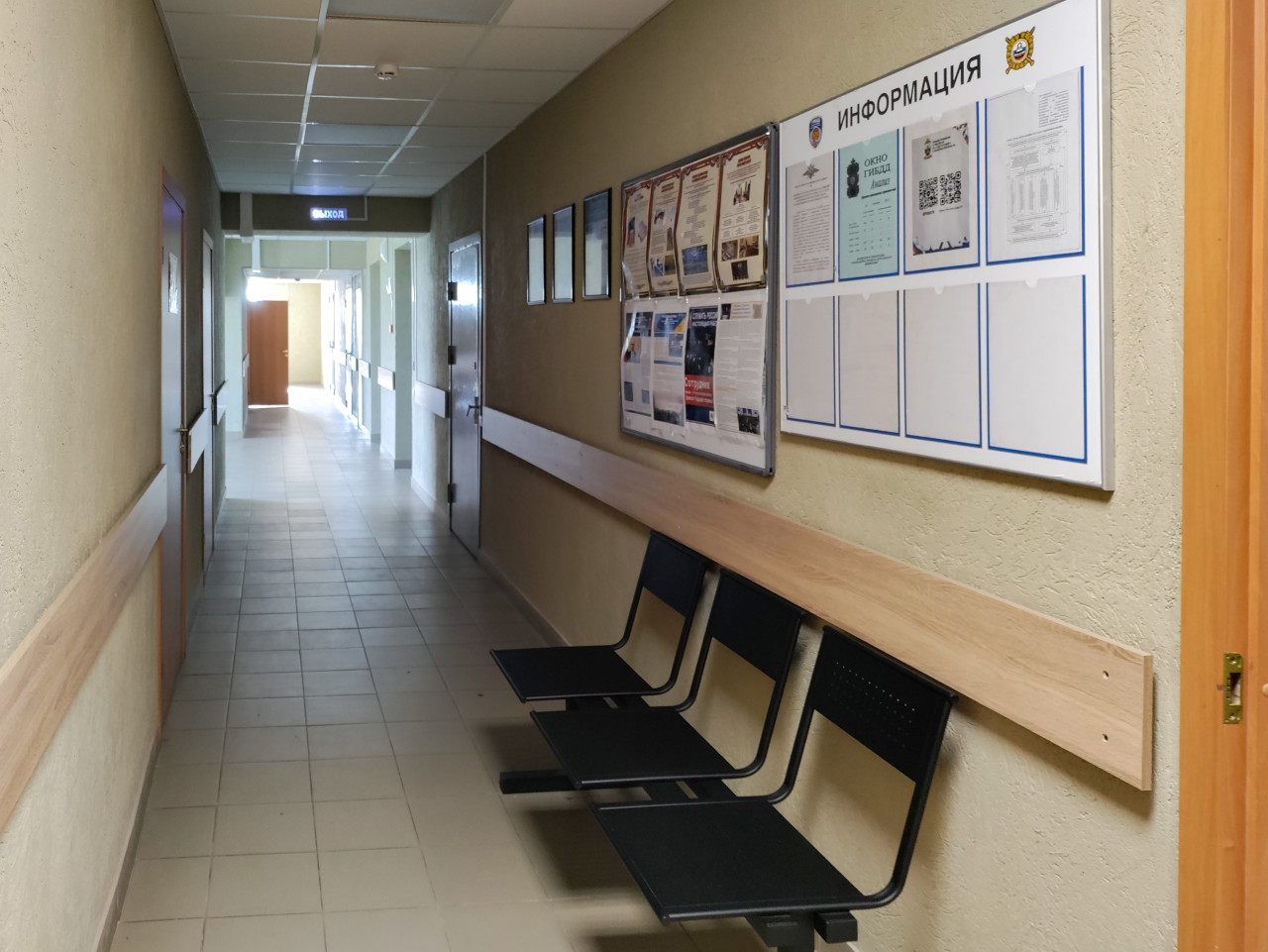На фото показан коридор административного здания, вероятно, отделения полиции или муниципальной службы. На стене размещены стенды с официальной информацией, включая объявления и инструкции. Под ними установлены металлические сиденья для посетителей. Потолок выполнен в подвесной конструкции, стены окрашены в светлый бежевый цвет, пол покрыт кафельной плиткой. В глубине коридора виднеется дверь и вывеска «Выход». Сцена характерна для учреждений, где ведётся приём граждан или обработка документов. Фото подходит для иллюстраций, связанных с госуслугами, административной архитектурой и деловой средой.