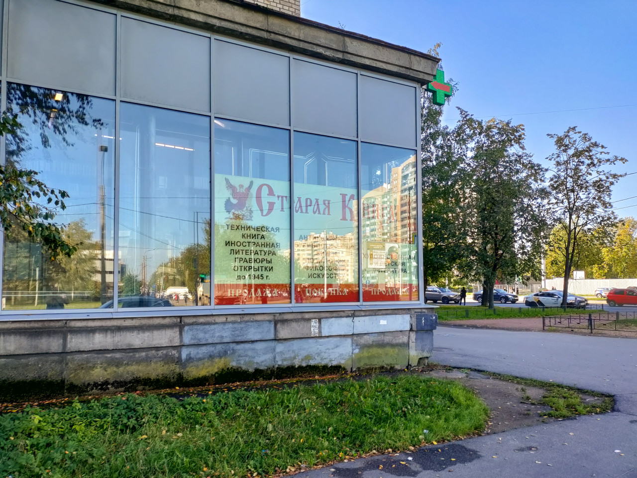 На снимке показан боковой фасад магазина «Старая книга» с витринами, оформленными рекламными плакатами. На прозрачных стёклах читаются надписи о продаже технической, иностранной и художественной литературы. Отражения деревьев и домов в стекле добавляют композиции глубину. У подножия фасада виден бетонный цоколь с следами времени и мхом. Вокруг — зелёная трава и асфальтовая дорожка, типичные для дворов Петербурга. Изображение передаёт атмосферу старого советского района с сохранившимися коммерческими вывесками и магазинами, работающими десятилетиями. Фото можно использовать для материалов о городской среде и культуре повседневности.