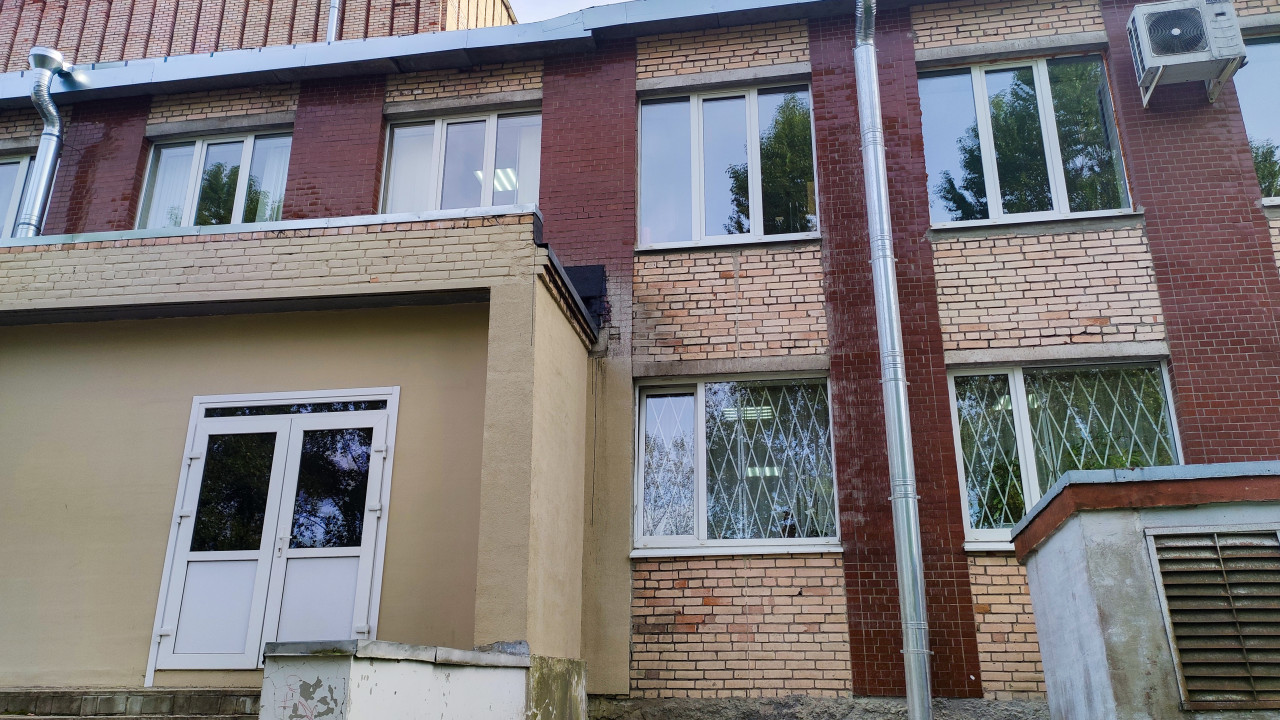 Изображён участок фасада общественного здания, выполненного из комбинированной кирпичной кладки. Центральная часть — выступающая пристройка с бежевой штукатуркой и белыми дверьми. Окна оборудованы металлическими решётками, что указывает на административное или учебное назначение постройки. На стене видна новая оцинкованная водосточная труба и элементы вентиляции. Кирпичная кладка местами имеет следы старения, но обновлена частично. Снимок можно использовать в тематике обследования зданий, реконструкции фасадов, архитектурных отчётов или инженерных проектов.