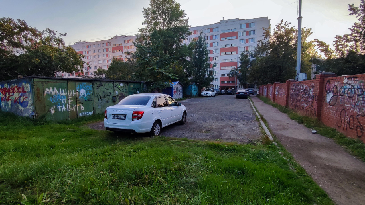 На фотографии изображён двор жилого района с неформальной парковкой у рядов металлических гаражей. На зелёных воротах видна надпись «Машины не ставить», выполненная краской. На переднем плане припаркован белый автомобиль Lada с петербургскими номерами, на заднем — другие машины, стоящие вдоль проезда. По правую сторону тянется кирпичная стена, покрытая граффити. Вдали виден многоэтажный дом типовой застройки. Фото можно использовать в материалах о городской инфраструктуре, транспортных зонах, благоустройстве дворов и визуальных исследованиях городской среды.