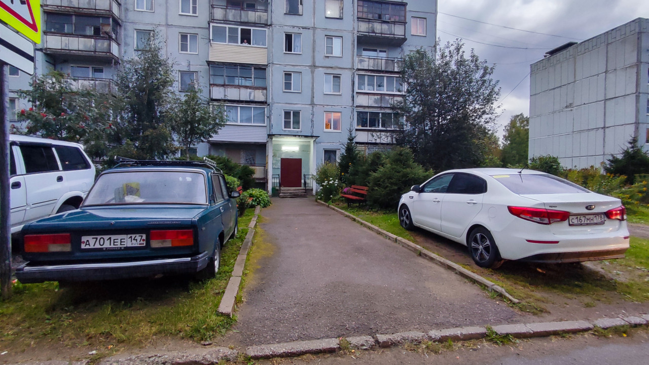 На фотографии изображён вход в подъезд пятиэтажного жилого панельного дома советского типа. С обеих сторон от асфальтированной дорожки припаркованы автомобили — старая «Волга» и современный седан Kia Rio. Вдоль фасада видны застеклённые балконы, кустарники и лавочка у входа. Сцена отражает типичный облик жилых кварталов конца XX века в России. Изображение может использоваться в материалах о городской среде, повседневной архитектуре и инфраструктуре.