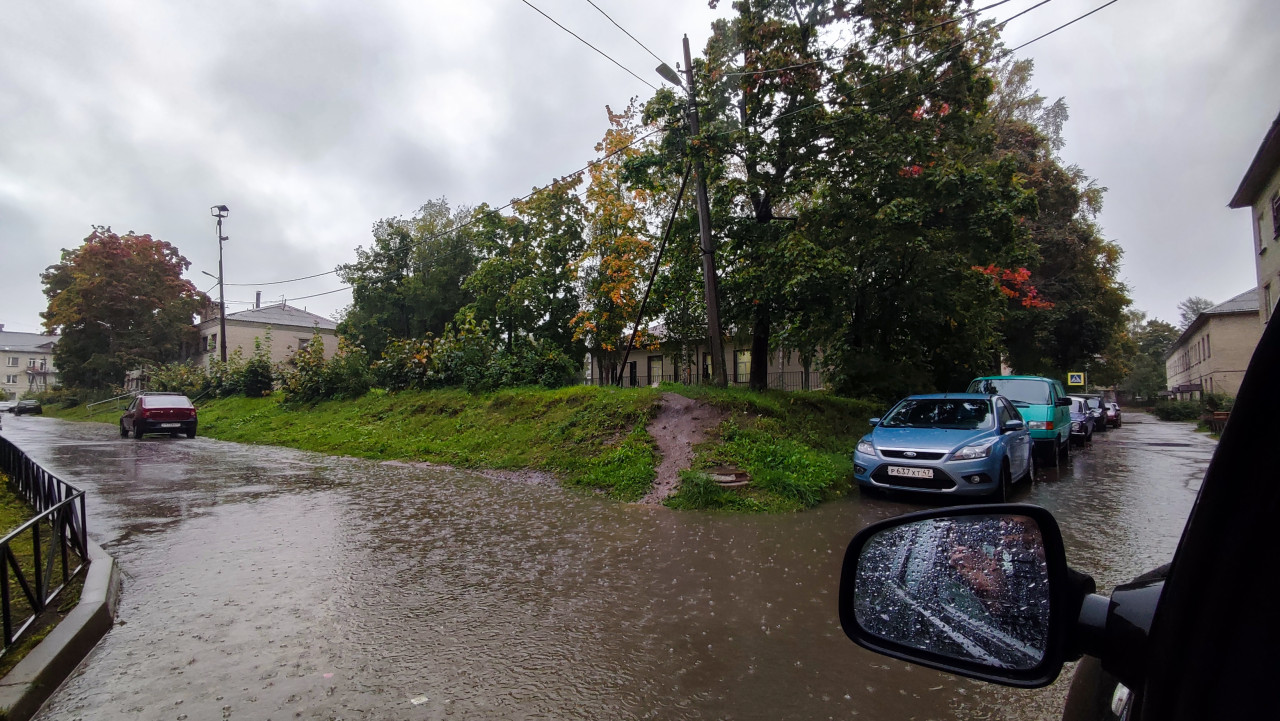 Осенний дождливый день в жилом квартале с лужами на дороге
