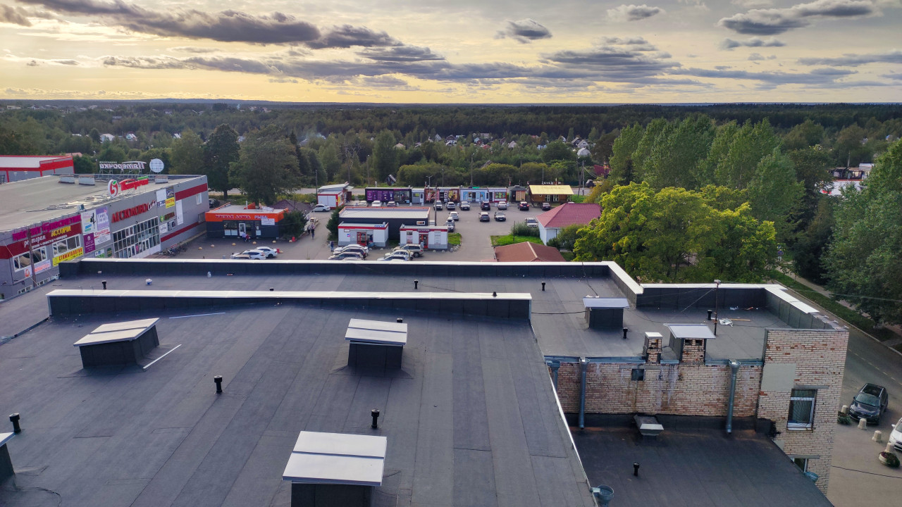 На фотографии запечатлена городская панорама с высоты здания. На переднем плане видна плоская кровля с вентиляционными коробами и водостоками, а внизу — торговые объекты и стоянка автомобилей. На горизонте простирается зелёный массив леса. Фото демонстрирует типичное сочетание промышленной и коммерческой застройки малых российских городов. Снимок может быть использован для тем урбанистики, архитектуры, городского планирования и строительного надзора.