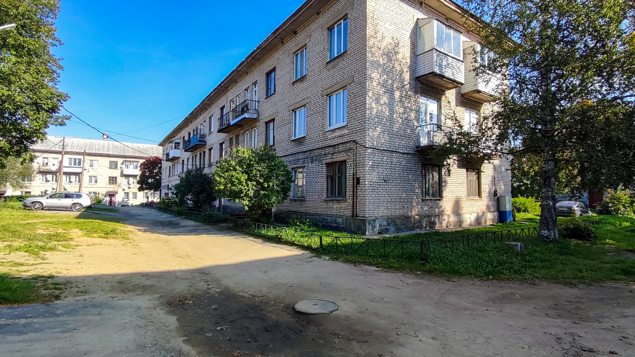 Угол жилого квартала с трёхэтажными домами и грунтовой дорогой