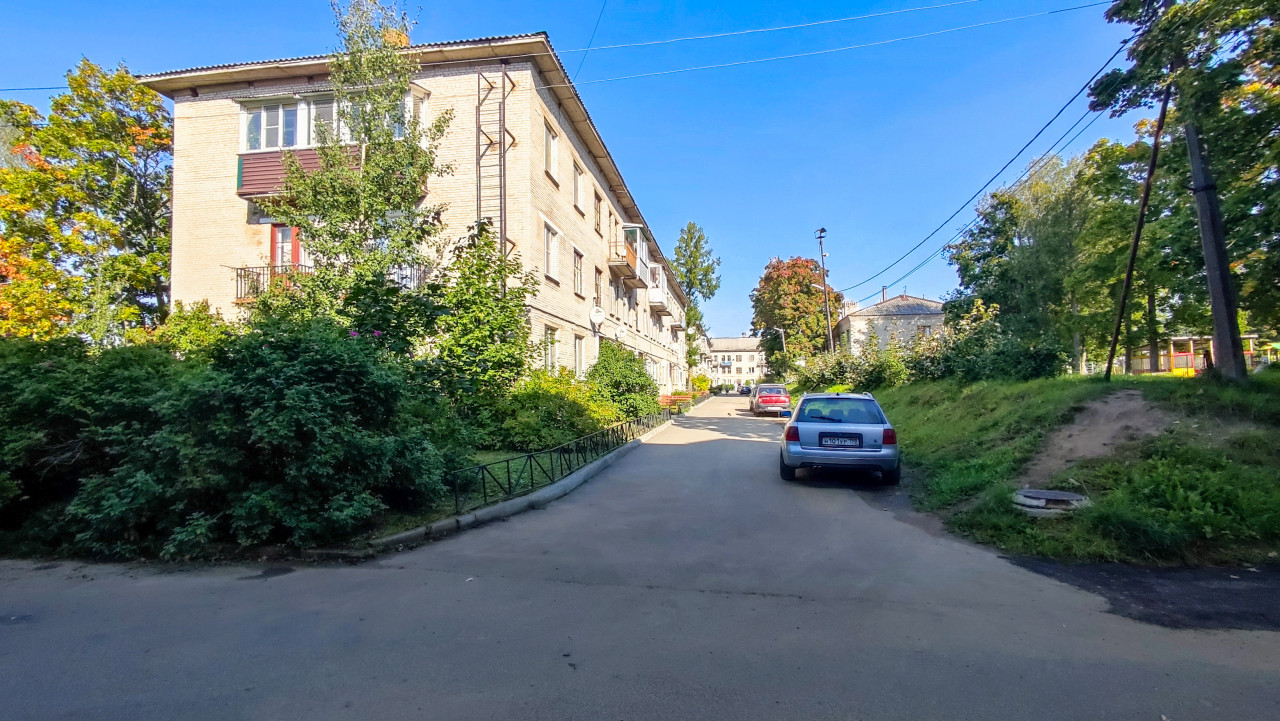 На фотографии изображён типичный жилой двор в небольшом российском городе или посёлке. Слева и справа видны трёхэтажные кирпичные дома советского периода, построенные, вероятно, в 1960–1970-х годах. Фасады зданий выполнены из светлого кирпича, с металлическими лестницами на крышу и стандартными балконами. Вдоль домов растут деревья и кустарники, часть из которых частично закрывает окна первых этажей. По дворовой дороге припаркованы автомобили, асфальтовое покрытие в удовлетворительном состоянии. На заднем плане виднеется ещё одно здание, также типовой архитектуры. Освещение и тени указывают на то, что съёмка велась в ясный летний или раннеосенний день. Этот снимок можно использовать для иллюстрации городской среды, архитектуры послевоенного периода или тем благоустройства дворов.
