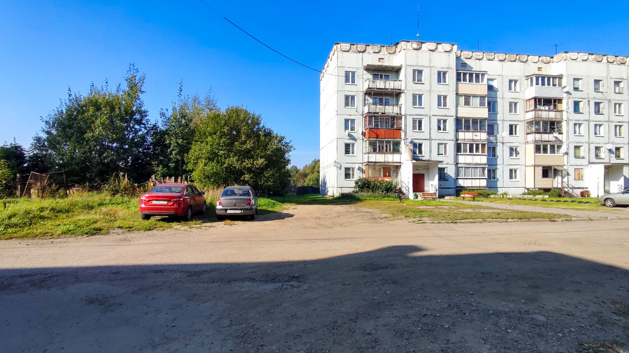 Пятиэтажный жилой дом советской постройки и открытая площадка с машинами