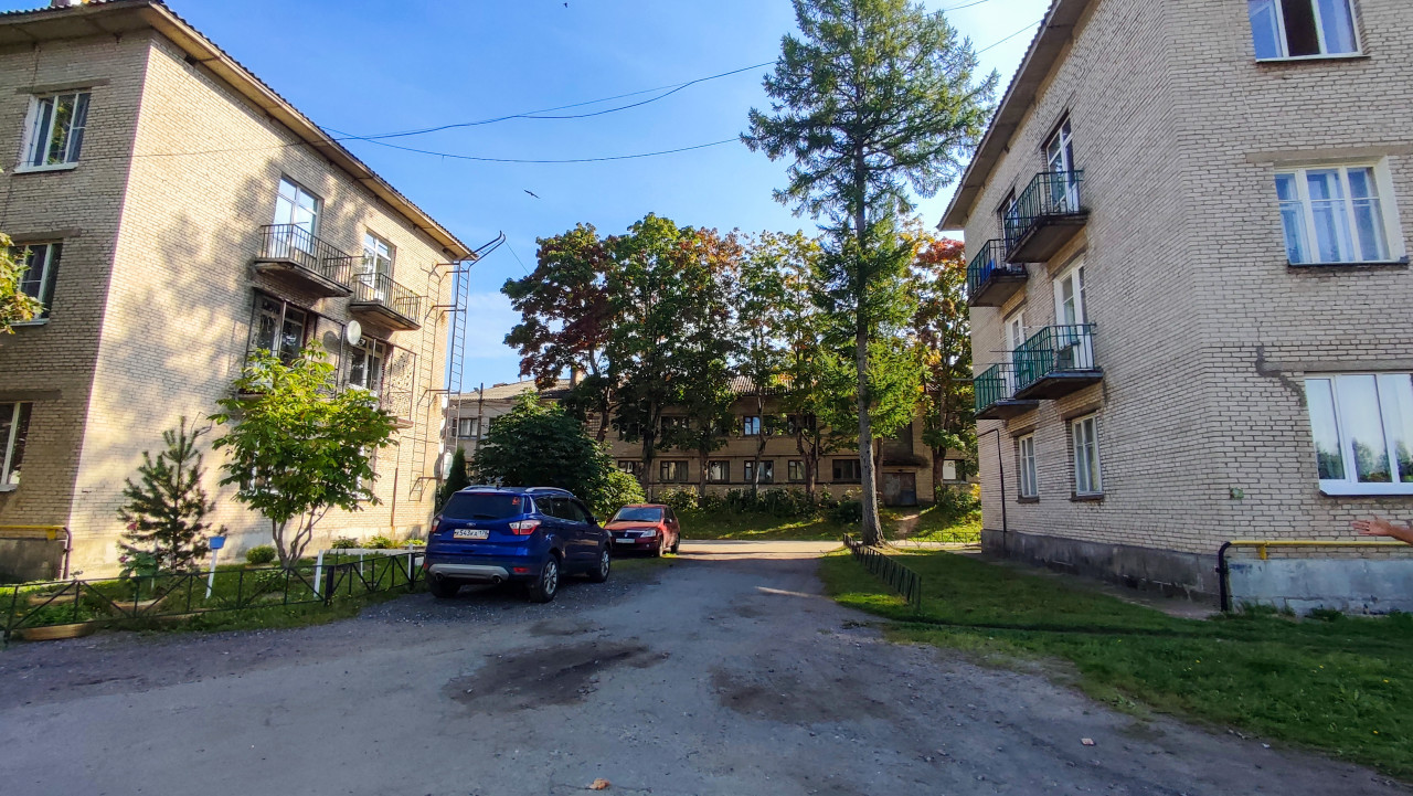 Двор между жилыми домами с припаркованными автомобилями и деревьями
