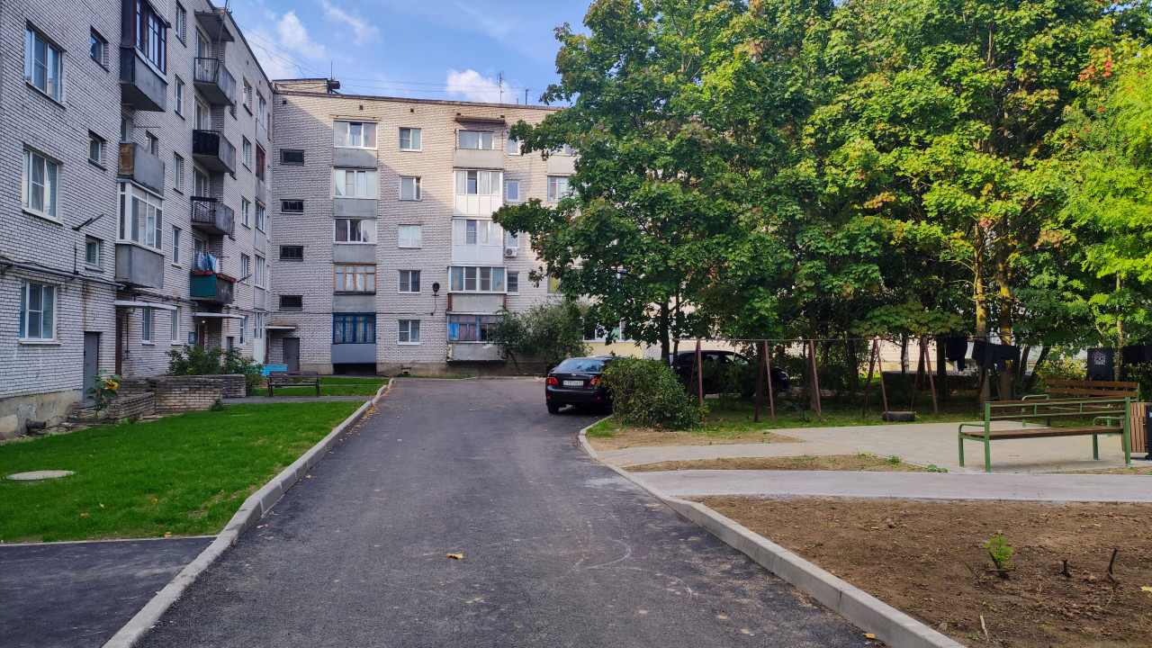 Двор пятиэтажного жилого дома с обновлённым асфальтом и зелёными насаждениями