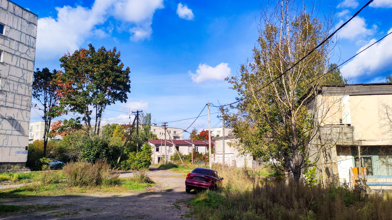 На фотографии изображён фрагмент старого жилого квартала с двухэтажными и частично заброшенными домами, соединёнными воздушными линиями электропередачи. Видны деревья с осенней листвой, кустарники и одиночный автомобиль у края дороги. Слева — фасад многоэтажного панельного дома с видимыми следами утепления. Фото передаёт атмосферу провинциального двора, где сочетаются жилые и полуразрушенные здания, сохранившиеся с советского периода. Изображение подходит для использования в материалах об урбанистике, архитектуре, реконструкции и инженерных сетях старого фонда.