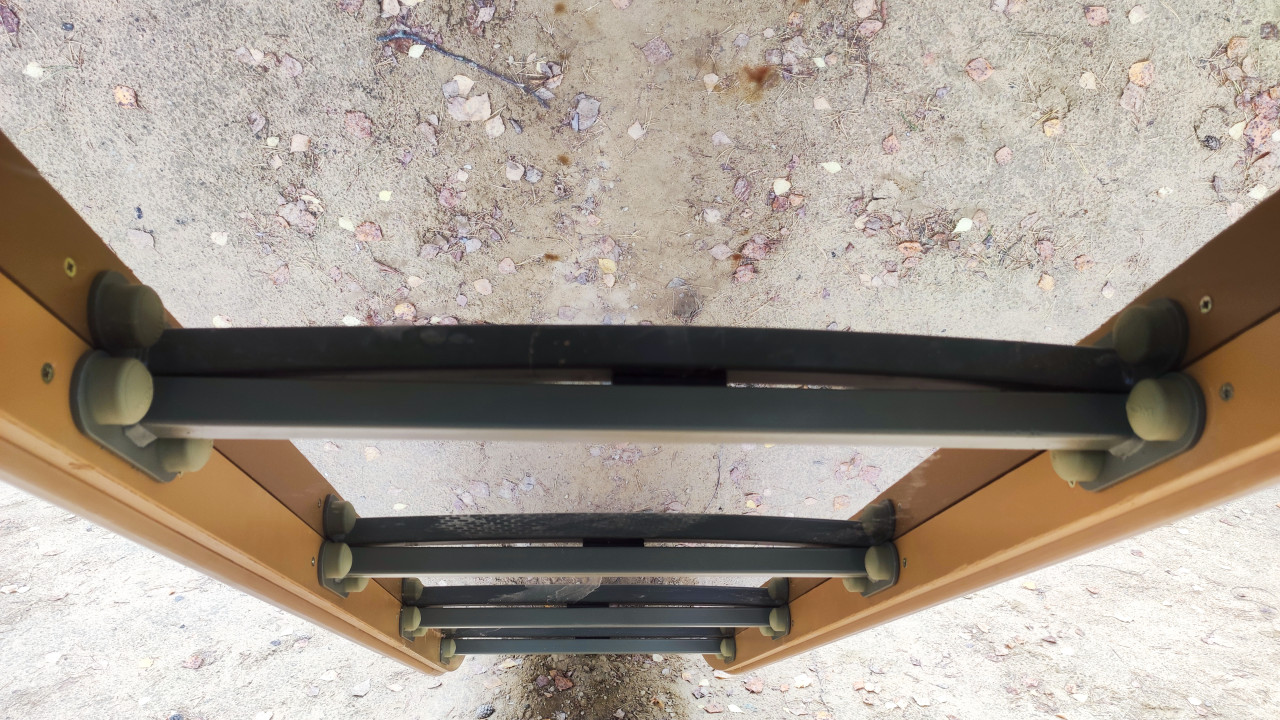На фотографии показан фрагмент металлической лестницы детского игрового комплекса, снятый крупным планом. Видны детали креплений и покрытие ступеней, выполненных из металлических труб с пластиковыми вставками. На фоне — песчаная поверхность площадки с опавшими листьями. Снимок демонстрирует конструктивные особенности оборудования и может использоваться в тематике безопасности детских площадок, проектирования и монтажа элементов детского досуга.