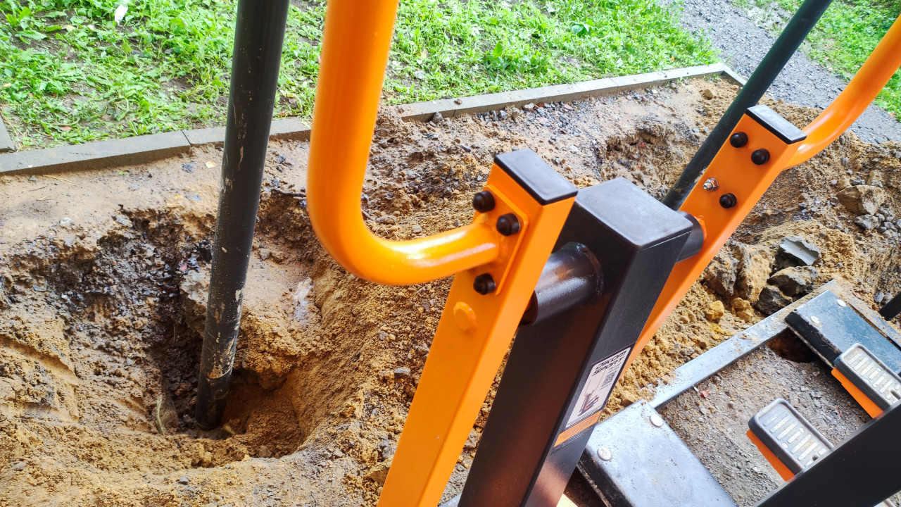 На фотографии крупным планом показан участок монтажа тренажёра: виден металлический каркас, оранжевая рукоятка и отверстие в грунте, подготовленное под установку стойки. Рядом видна песчано-гравийная смесь и свежие следы земляных работ. Снимок отражает технологические детали монтажа уличного оборудования на спортивной площадке.