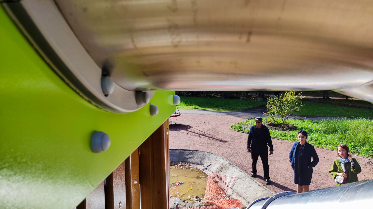 На фотографии изображено нижнее соединение металлической горки с каркасом детской площадки. Видны болтовые соединения, пластиковые элементы и часть зелёной панели конструкции. На заднем плане находятся люди, осматривающие площадку и элементы благоустройства. Снимок демонстрирует детали инженерного исполнения игровых комплексов и может использоваться для тематики контроля безопасности, приёмки работ или технического надзора.