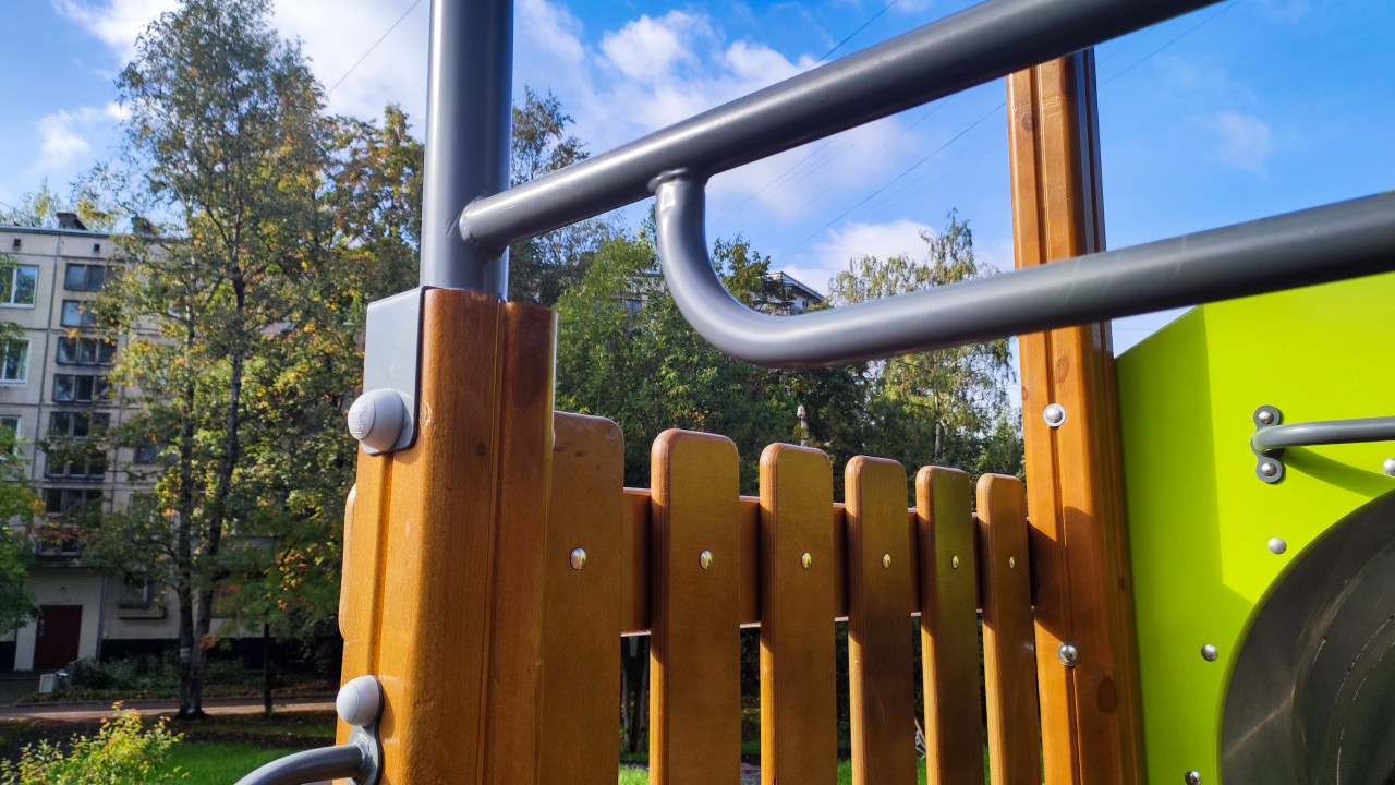 На фотографии показан участок каркаса и ограждения детского игрового комплекса. Металлические серые трубы образуют верхнюю рамку и поручни, соединённые с деревянными вертикальными элементами и ограждением из планок. На фоне виден жилой дом и зелёные деревья. Снимок отражает типовое конструктивное решение современных игровых площадок, сочетающих дерево и металл. Изображение подходит для публикаций о благоустройстве дворовых территорий и стандартах безопасности детских зон.