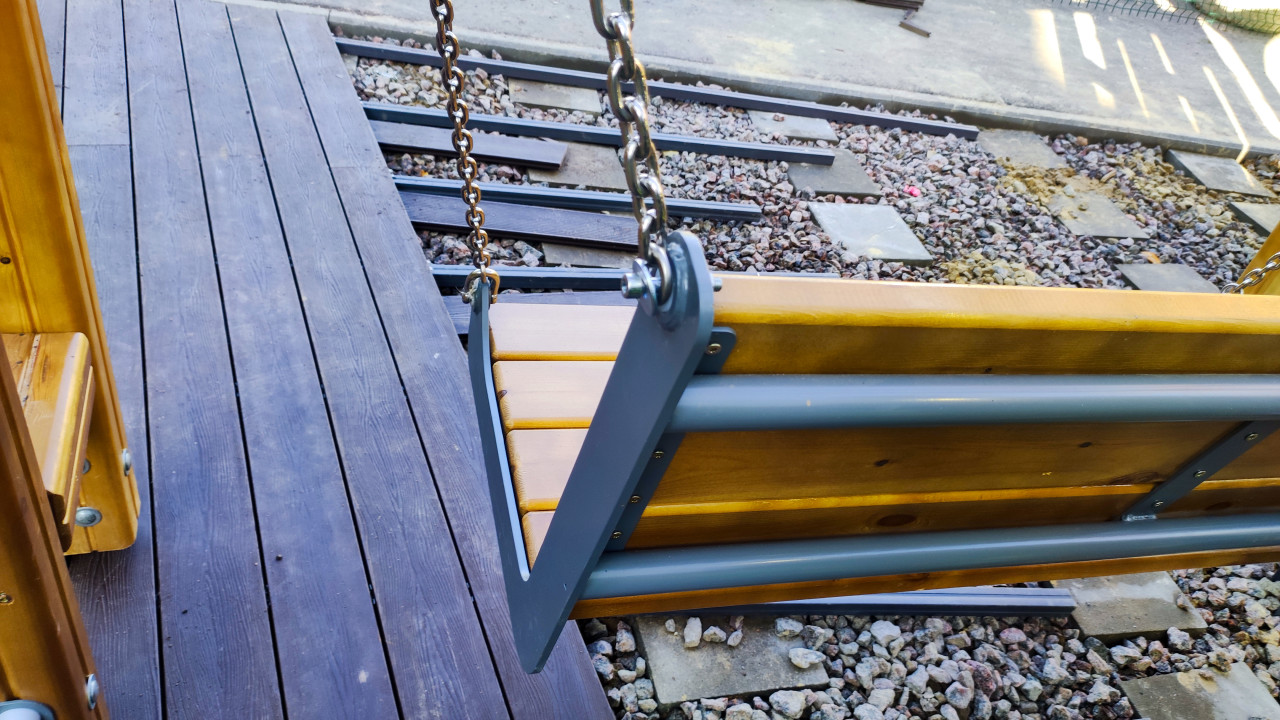 На снимке запечатлена подвесная деревянная скамья, закреплённая на металлических цепях в составе уличной архитектурной формы. Крепление выполнено с помощью металлических деталей и болтов. На полу — настил из досок, под конструкцией — щебёночное основание. Фото отражает современные решения благоустройства дворовых и общественных территорий с применением комбинированных материалов — дерева и металла.