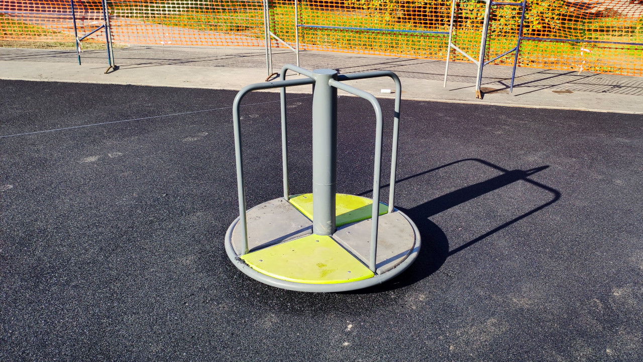 На фотографии показана детская карусель с металлическими поручнями и серо-жёлтой платформой, установленная на новом резиновом покрытии игровой площадки. Фон ограничен временным строительным ограждением из сетки, за которым виднеются кустарники и зелёные насаждения. Поверхность чистая, без следов эксплуатации, что указывает на недавнее завершение монтажных работ. Сцена отражает современные стандарты безопасности и эстетики при создании детских зон отдыха в российских городах. Изображение подходит для иллюстрации тем благоустройства и городской инфраструктуры.