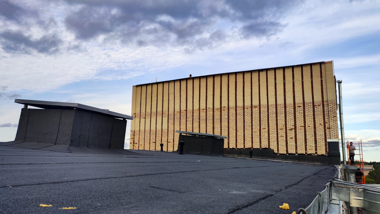 На фото изображён участок кровли с новыми рулонными покрытиями и вентиляционными коробами на фоне стены из бежевого и красного кирпича. Вертикальные элементы кладки создают рельефную структуру фасада, а металлические водостоки видны вдоль стены. Небо с облаками придаёт кадру нейтральное дневное освещение. Снимок может использоваться в материалах о строительстве, обследовании зданий и проектировании инженерных систем.