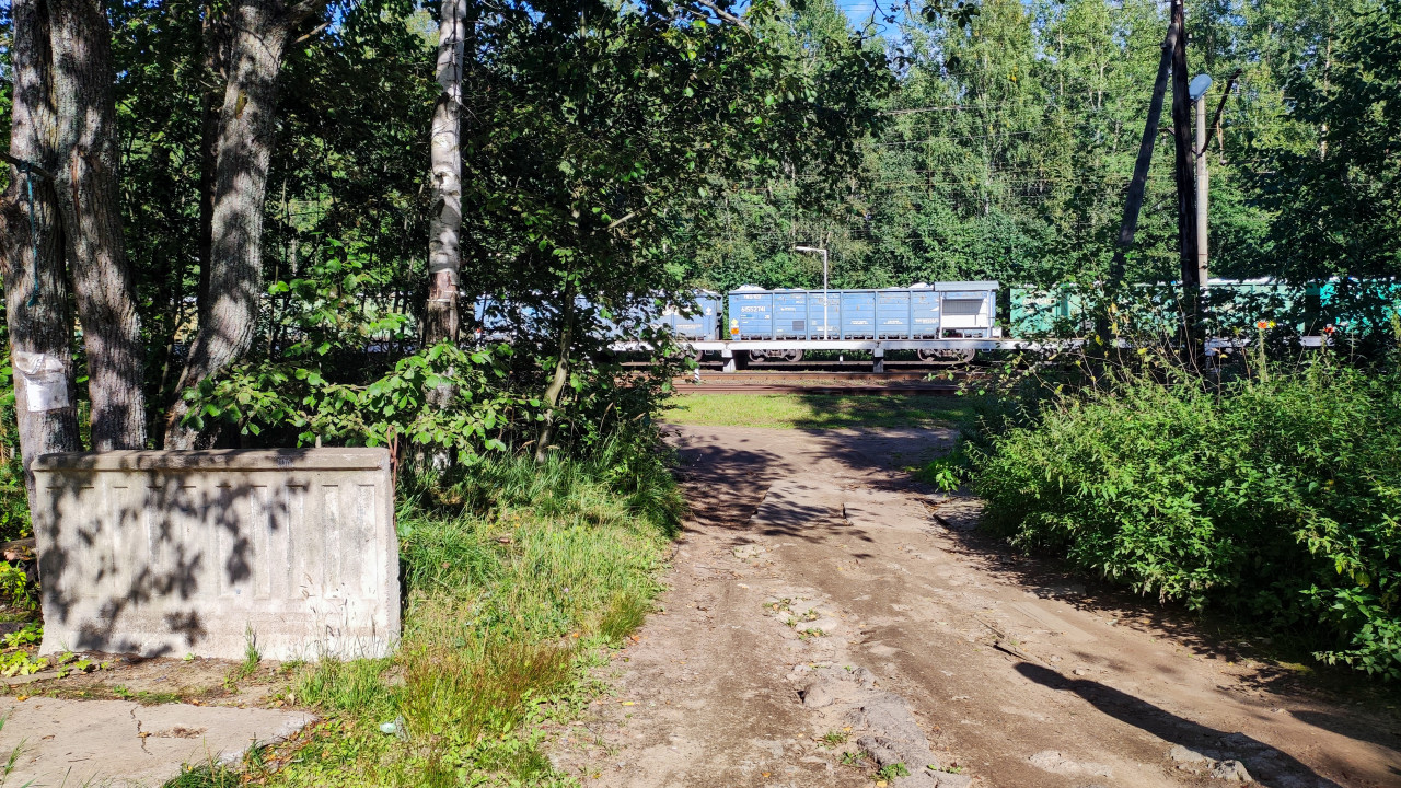 На фотографии изображён участок грунтовой дороги, ведущей к железнодорожным путям. Вдоль дороги растут деревья и кустарники, видны старые бетонные элементы дренажного сооружения. На заднем плане — железнодорожные вагоны с грузовыми контейнерами, стоящие на путях. Сцена отражает сочетание природной и промышленной среды, характерное для пригородных зон и промышленных окраин. Фото может использоваться в темах транспорта, инфраструктуры и строительного обследования.