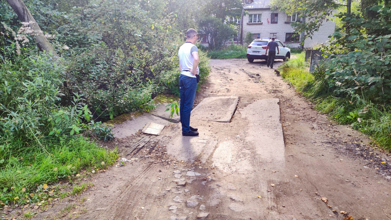 На фотографии изображён участок грунтовой дороги с частично уложенными бетонными плитами, часть которых просела и имеет трещины. На переднем плане мужчина осматривает состояние покрытия, вдалеке виден автомобиль и жилой дом. По краям дороги растут кустарники и деревья. Снимок отражает типичное состояние подъездных путей в частных и муниципальных зонах без капитального благоустройства. Используется для иллюстрации обследований дорожного состояния и экспертиз технических дефектов.