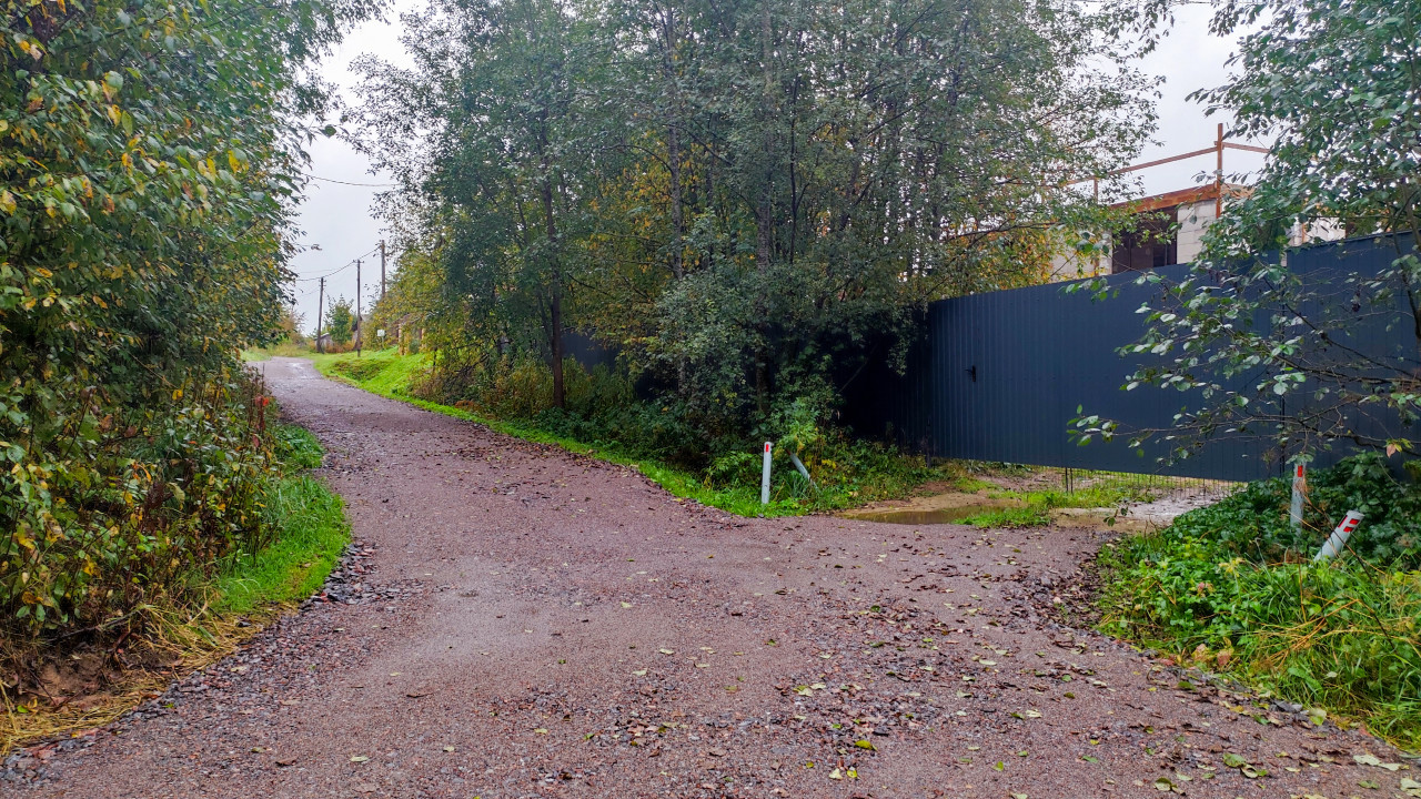 На фотографии показана развилка двух узких дорог с гравийным покрытием, одна из которых уходит влево, другая ведёт к забору из профлиста. По обочинам густые кусты и молодые деревья, над дорогой нависают ветви. На заднем плане видно строящееся здание с бетонными стенами и металлическими перекрытиями. Поверхность дороги влажная, по краям зелёная трава. Кадр отражает типичный вид пригородного посёлка Ленинградской области и подходит для иллюстрации тем частного строительства, инженерных сетей, благоустройства и сельской инфраструктуры.