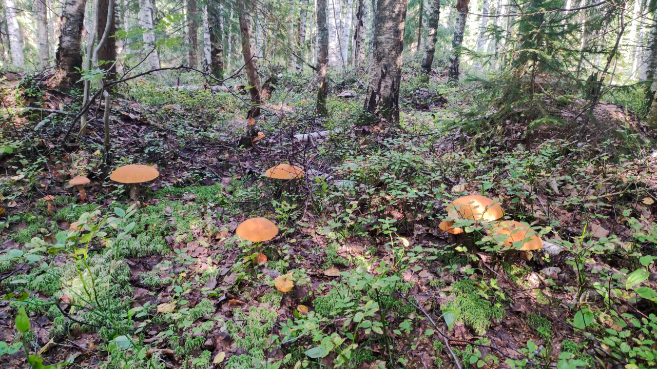 На фотографии изображён участок леса с берёзами и елями, где среди мха и опавших листьев растут грибы с оранжево-коричневыми шляпками. Освещение мягкое, типичное для летнего или раннеосеннего утра. Почва покрыта мхом, листвой и ветками. Кадр передаёт естественную среду обитания лесных грибов в умеренной климатической зоне России. Снимок можно использовать в статьях и изданиях о природе, грибных местах, экологии и флоре лесов.