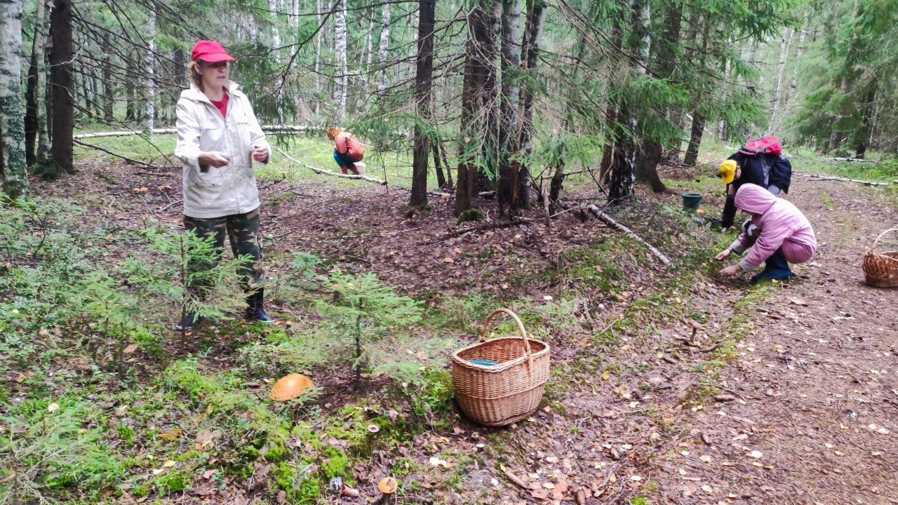 Сбор грибов в хвойном лесу с корзинами и ведром