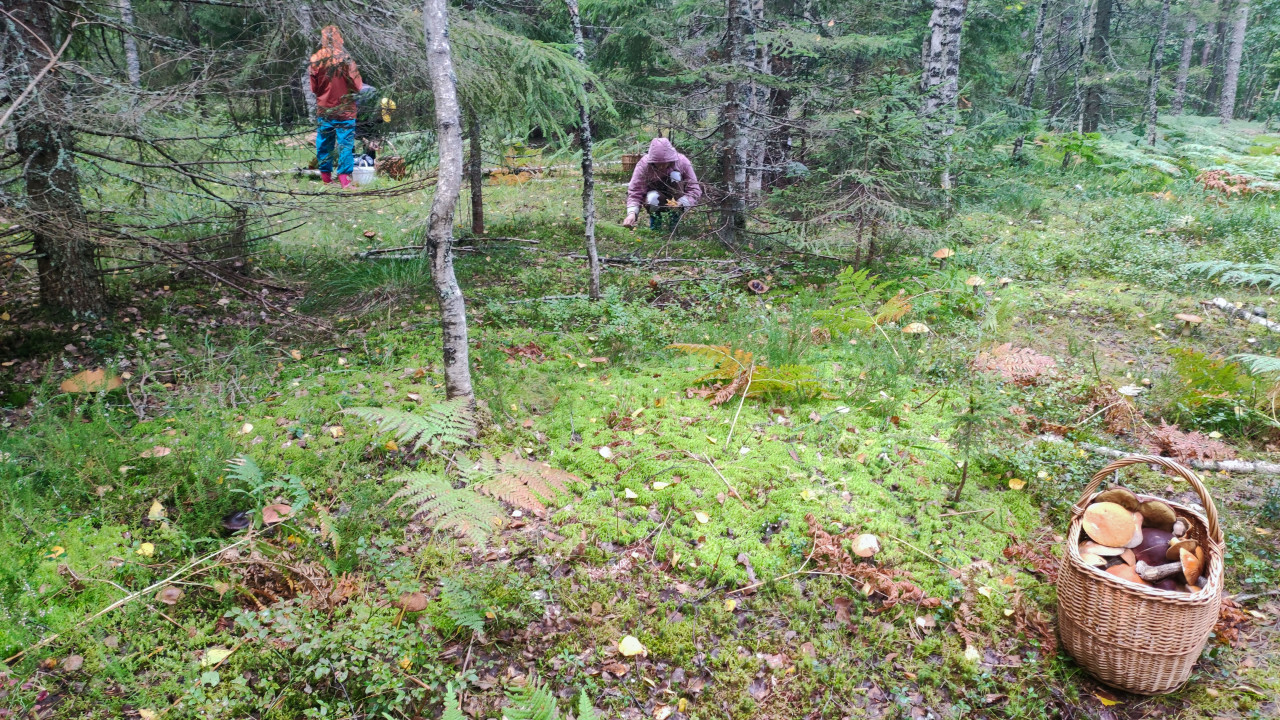 На фотографии изображены люди, собирающие грибы в хвойном лесу. На переднем плане стоит корзина, наполненная подосиновиками и белыми грибами. Вдали видны фигуры нескольких человек, одетых в тёплую одежду и резиновые сапоги. Земля покрыта мхом, листвой и папоротниками, что характерно для северных лесов. Сцена показывает семейный отдых на природе и традиционное занятие — «тихую охоту». Изображение можно использовать в статьях о грибах, экотуризме и лесной флоре.