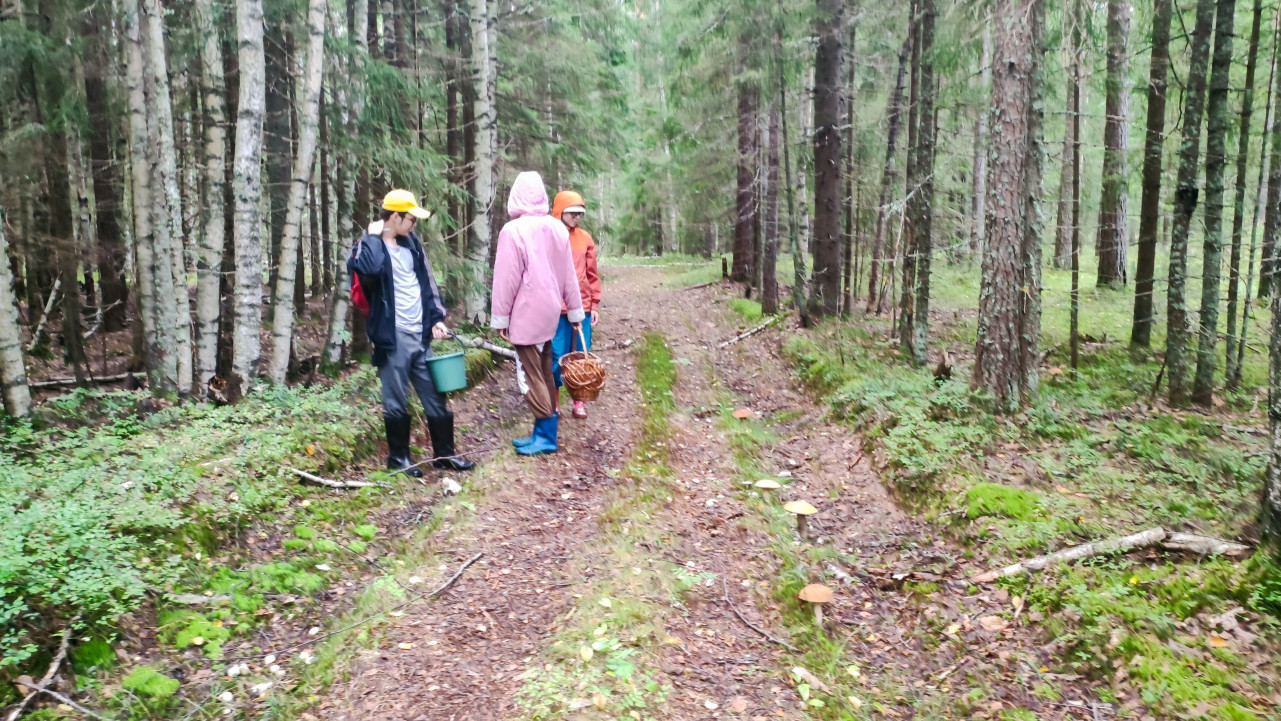 На фотографии изображены трое человек на лесной просёлочной дороге, окружённой хвойными и берёзовыми деревьями. Один человек держит зелёное ведро, другой — корзину, что указывает на сбор грибов. Люди одеты в непромокаемую одежду и резиновые сапоги, на головах — кепки и капюшоны. На земле видны грибы вдоль обочины. Сцена типична для осеннего сезона в северных лесах России. Фотография подходит для иллюстраций о лесных прогулках, экотуризме и традициях «тихой охоты».