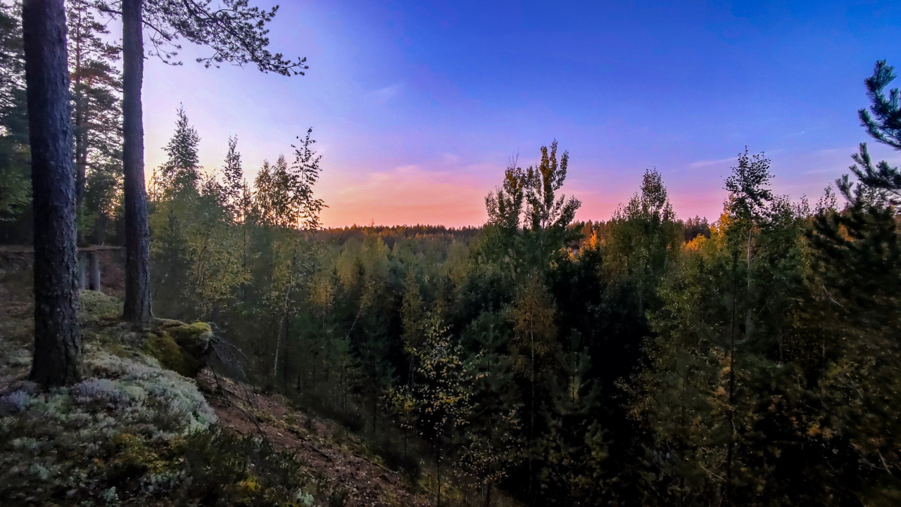 Фотография запечатлела вечерний вид с лесного склона, покрытого соснами, берёзами и мхом. На переднем плане — стволы деревьев и моховой покров, характерный для северных лесов. За ними открывается широкая панорама тайги, уходящей к горизонту, где небо окрашено в оттенки розового и синего. Судя по свету и растительности, снимок сделан в Ленинградской области в конце лета или начале осени. Это типичный ландшафт Карельского перешейка, с холмами, хвойными лесами и мягким северным светом. Изображение может быть использовано в материалах о природе Северо-Запада России, экологии и туризме.