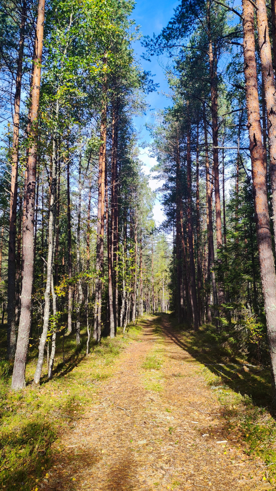 На снимке изображена прямая лесная дорога, проложенная через сосновый бор. Узкая тропа уходит вдаль, освещённая солнцем, проходящим сквозь кроны деревьев. На земле лежит сухая хвоя, вокруг — густой хвойный лес с берёзами и елями. Судя по свету и листве, фото сделано в конце лета или начале осени в Ленинградской области. Изображение отражает спокойствие и глубину северной природы, подходит для тем путешествий, туризма и экологии.