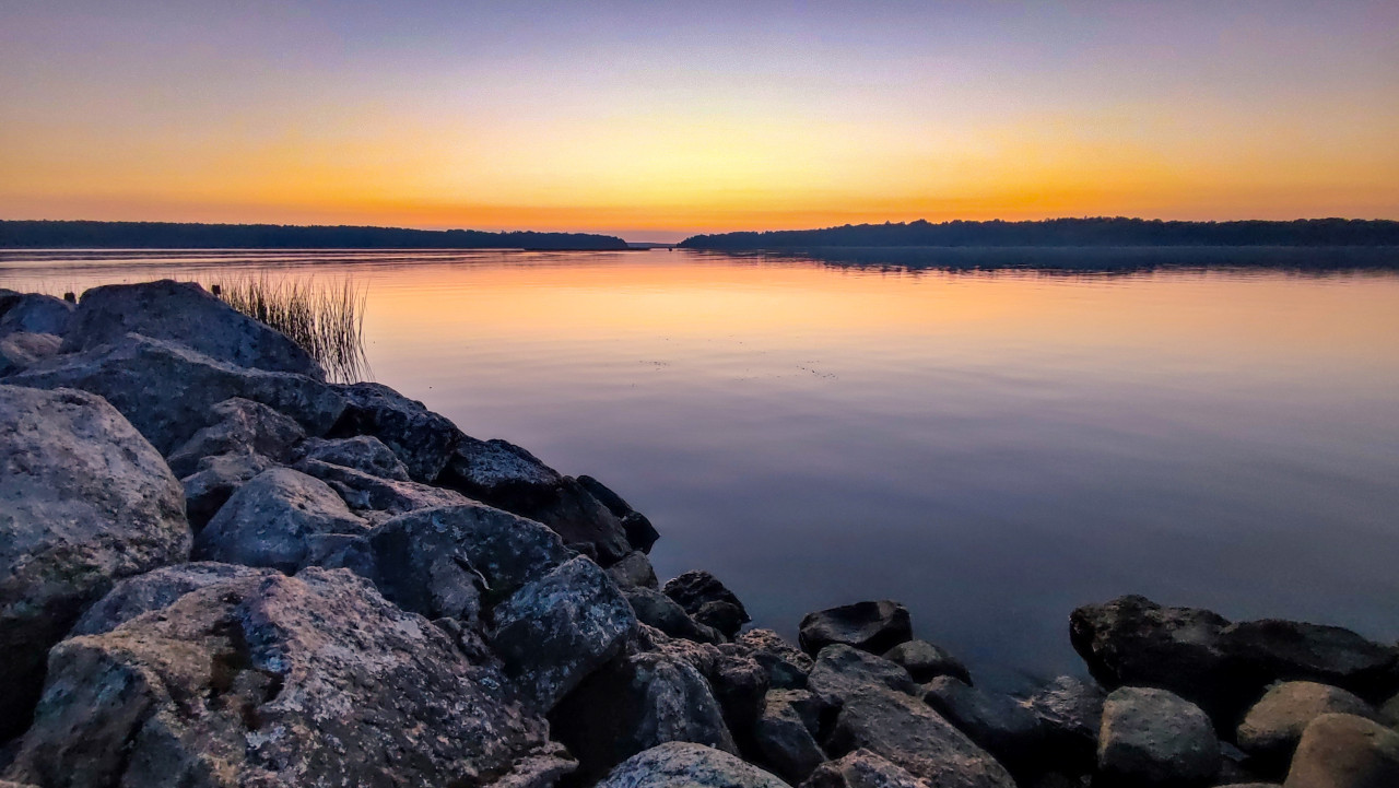 Фотография показывает берег озера, сложенный крупными камнями, которые уходят вглубь кадра к зеркальной воде. Закат окрашивает небо и поверхность воды в мягкие градиенты от оранжевого до фиолетового. Камни на переднем плане добавляют текстуру и контраст к гладкости воды, а узкая полоса тростников слева усиливает композиционное равновесие. Снимок передаёт спокойствие и ощущение северного вечера. Подходит для использования в природных галереях, туристических ресурсах и как иллюстрация темы гармонии природы и человека.