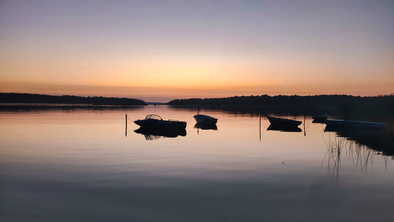 На фотографии изображено несколько лодок, пришвартованных у берега в спокойной заводи. Вода почти зеркальна и отражает мягкие тона неба — от тёплого оранжевого у горизонта до холодного сиреневого в верхней части кадра. На заднем плане видна тёмная линия леса, которая отделяет небо от водной глади. Судя по освещению, снимок сделан на закате или рассвете, когда солнце уже опустилось за горизонт. Фото передаёт тишину и уединённость природы, подходит для использования в туристических материалах, рекламных буклетах о путешествиях, сайтах о рыбалке и активном отдыхе.
