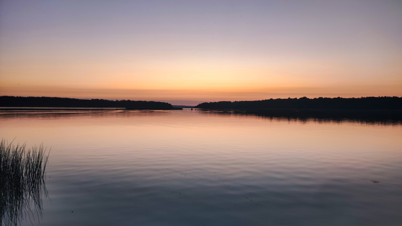 На снимке изображён водоём в вечерних сумерках. Линия горизонта делит кадр на две равные части, создавая симметричный пейзаж. Мягкое свечение заката окрашивает небо и воду в оттенки розового, сиреневого и янтарного. На дальнем плане просматриваются контуры леса и узкий проход между берегами, где теряется линия света. Фото выполнено в жанре пейзажной съёмки и передаёт атмосферу покоя и завершения дня. Может использоваться в календарях, природных альбомах, тематических статьях о северных регионах и отдыхе на воде.