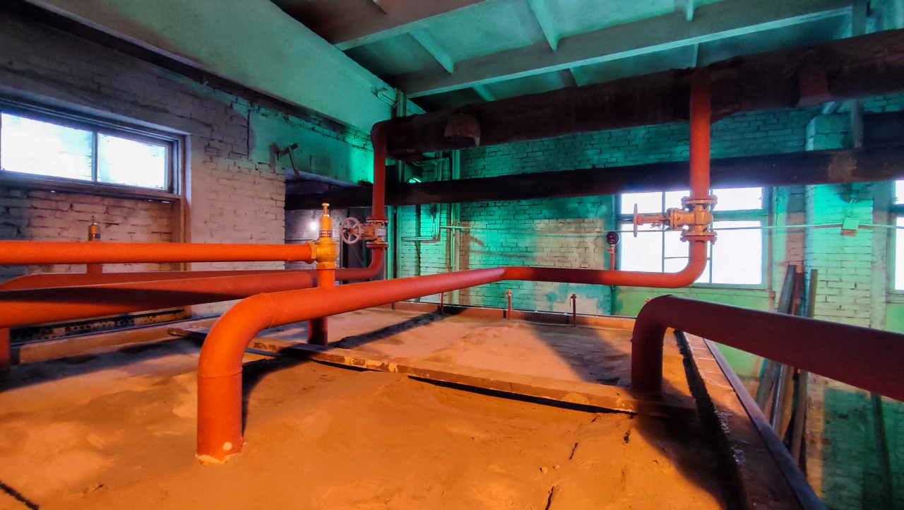 На снимке показана верхняя часть котельного оборудования с системой красных труб, проходящих над кирпичными корпусами топок. Видны запорные клапаны, фланцевые соединения и элементы измерительных приборов. Поверхность кирпичной кладки покрыта слоем пыли и следами длительной эксплуатации. Через окна пробивается дневной свет, создавая контраст между естественным и искусственным освещением. Изображение иллюстрирует промышленную инфраструктуру и внутренние инженерные коммуникации старых котельных.