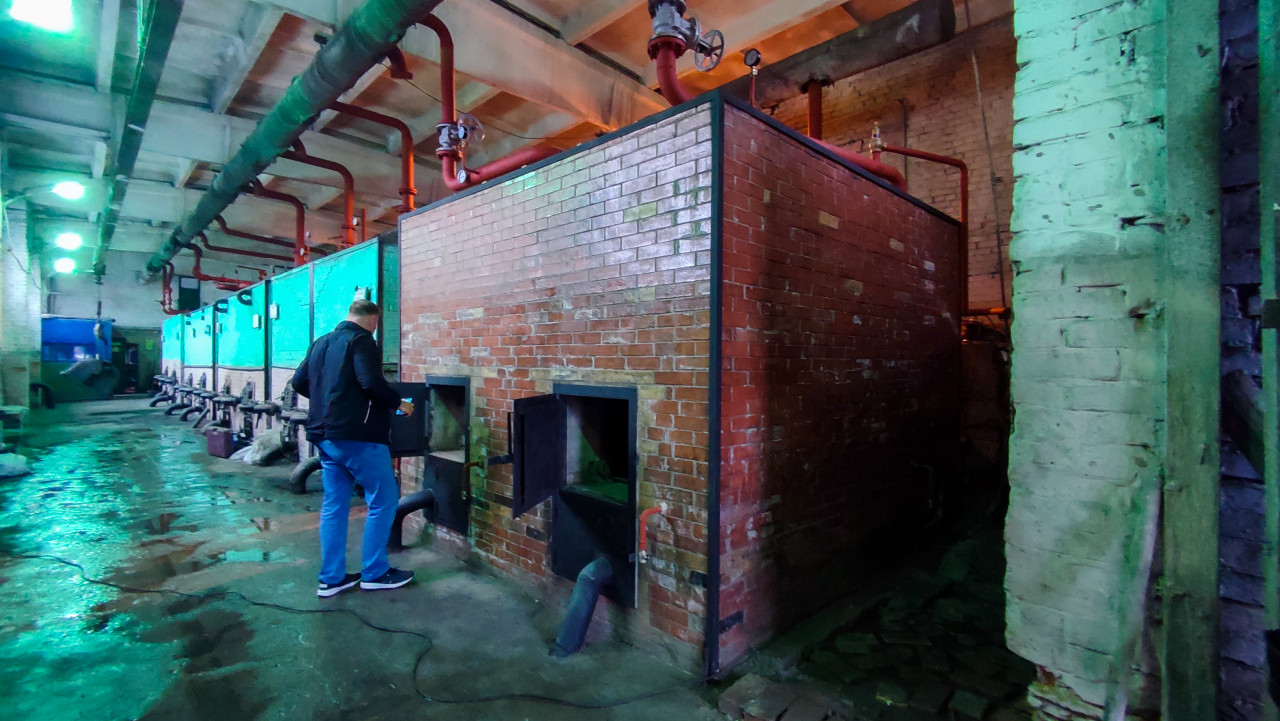 На фотографии изображено помещение старой котельной, где вдоль стены выстроены массивные кирпичные топки с металлическими дверцами. Мужчина в рабочей одежде осматривает одну из топок. Над установками проходят трубы подачи теплоносителя с запорной арматурой, закреплённые под потолком. Освещение имеет характерный зеленовато-синий оттенок, создавая индустриальную атмосферу. Подобные котельные строились в середине XX века для отопления промышленных зданий и жилых кварталов. Фото может использоваться в материалах о теплотехнических системах, реконструкции и промышленной архитектуре.