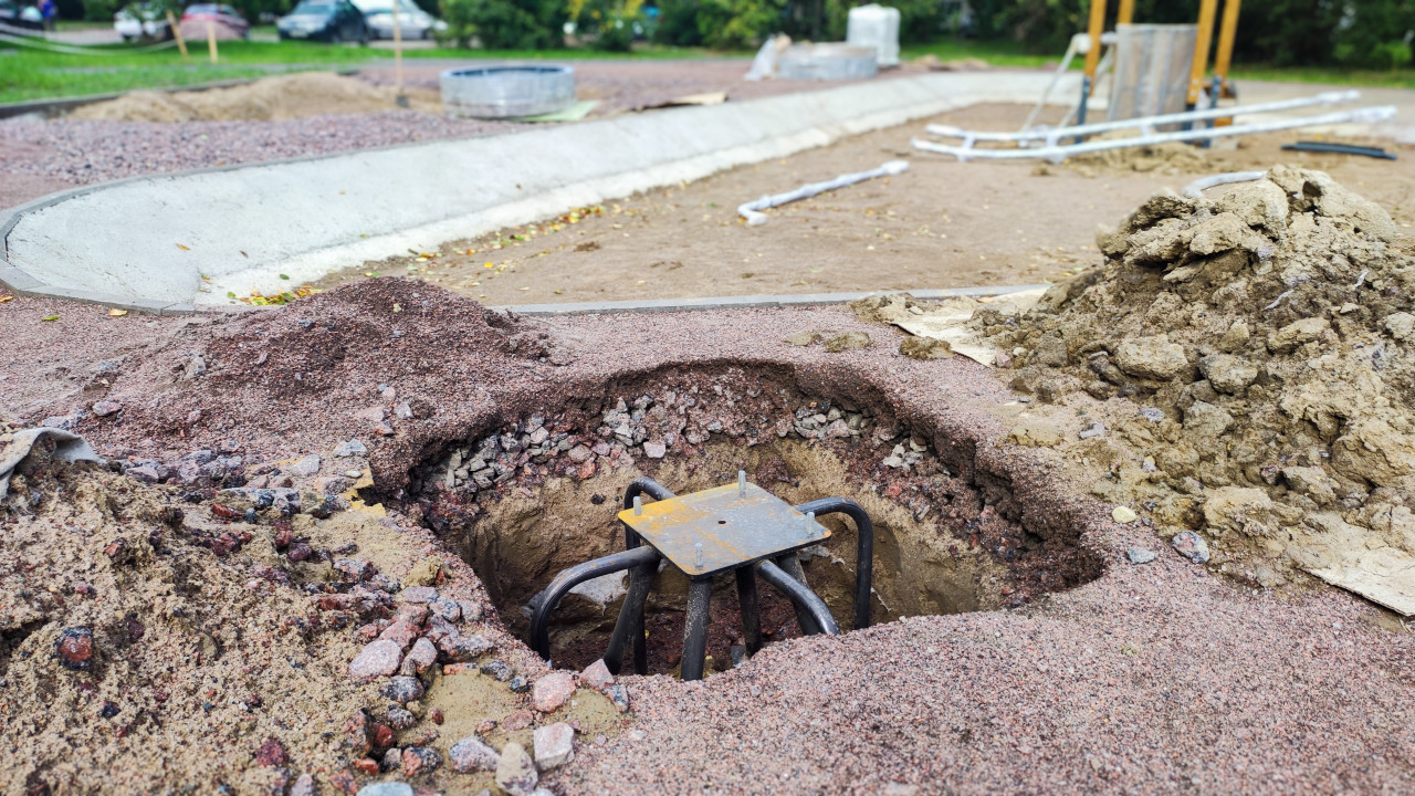 На снимке показана строительная яма с установленным арматурным каркасом и металлической закладной деталью для крепления опоры. Вокруг виден гравий, песок и следы земляных работ. На заднем плане различимы элементы площадки и другие подготовленные основания. Фото может использоваться в статьях о благоустройстве, монтаже уличных конструкций, инженерных коммуникациях и строительных технологиях.