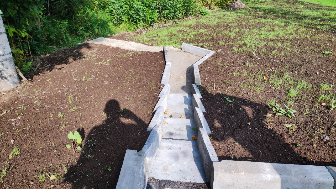 Бетонный ливневый лоток на откосе с зелёным покровом