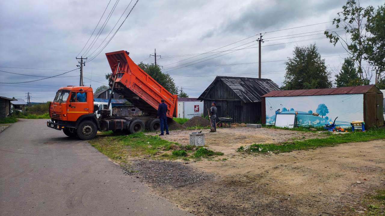 На фото изображён момент выгрузки песка из кузова оранжевого самосвала на сельской улице. Рядом стоят два рабочих, наблюдающих за процессом, видны деревянные постройки, металлический гараж с рисунком и хозяйственный инвентарь. Сцена отражает бытовой этап подготовки к строительным или благоустроительным работам. Подходит для материалов о загородной жизни, строительстве и дорожных работах.