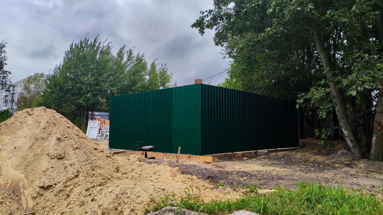 На снимке показан участок с возведённым зелёным металлическим ограждением из профлиста, установленным по периметру бетонного основания. На переднем плане находится насыпь песка и строительные материалы, на заднем — деревья и жилые дома. Сцена отражает процесс завершения строительства хозяйственного объекта или склада. Изображение можно использовать в статьях о благоустройстве, частном строительстве и установке металлических заборов.