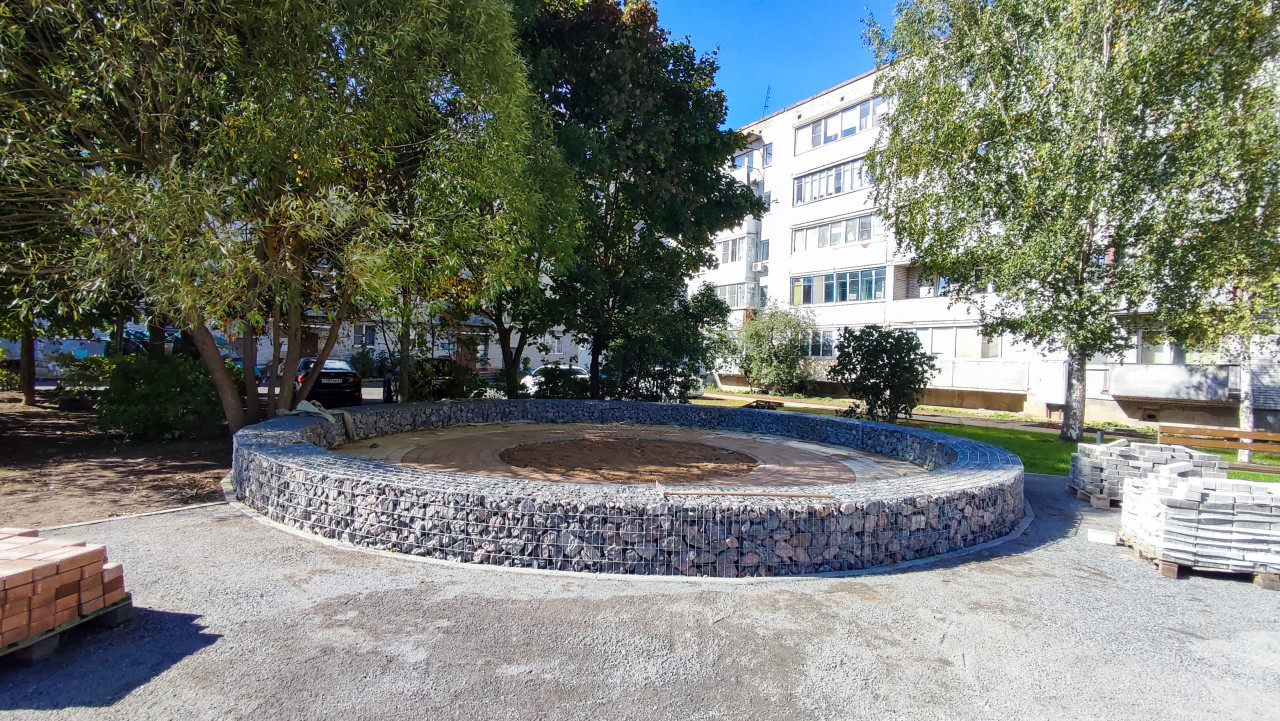 На фотографии изображена круглая каменная площадка, выполненная из габионов, расположенная во дворе жилого квартала. Вокруг растут деревья, а рядом видны стопки тротуарной плитки и строительные материалы. Снимок демонстрирует элемент благоустройства — каменное основание, которое может использоваться как декоративная зона или основа под малую архитектурную форму. Фото подходит для статей о благоустройстве, инженерных решениях и городской архитектуре.