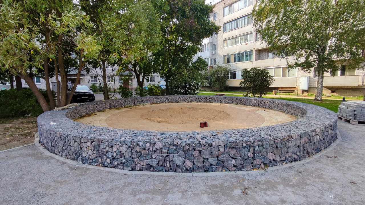 Круглая площадка из габионов с песчаным покрытием во дворе многоквартирного дома