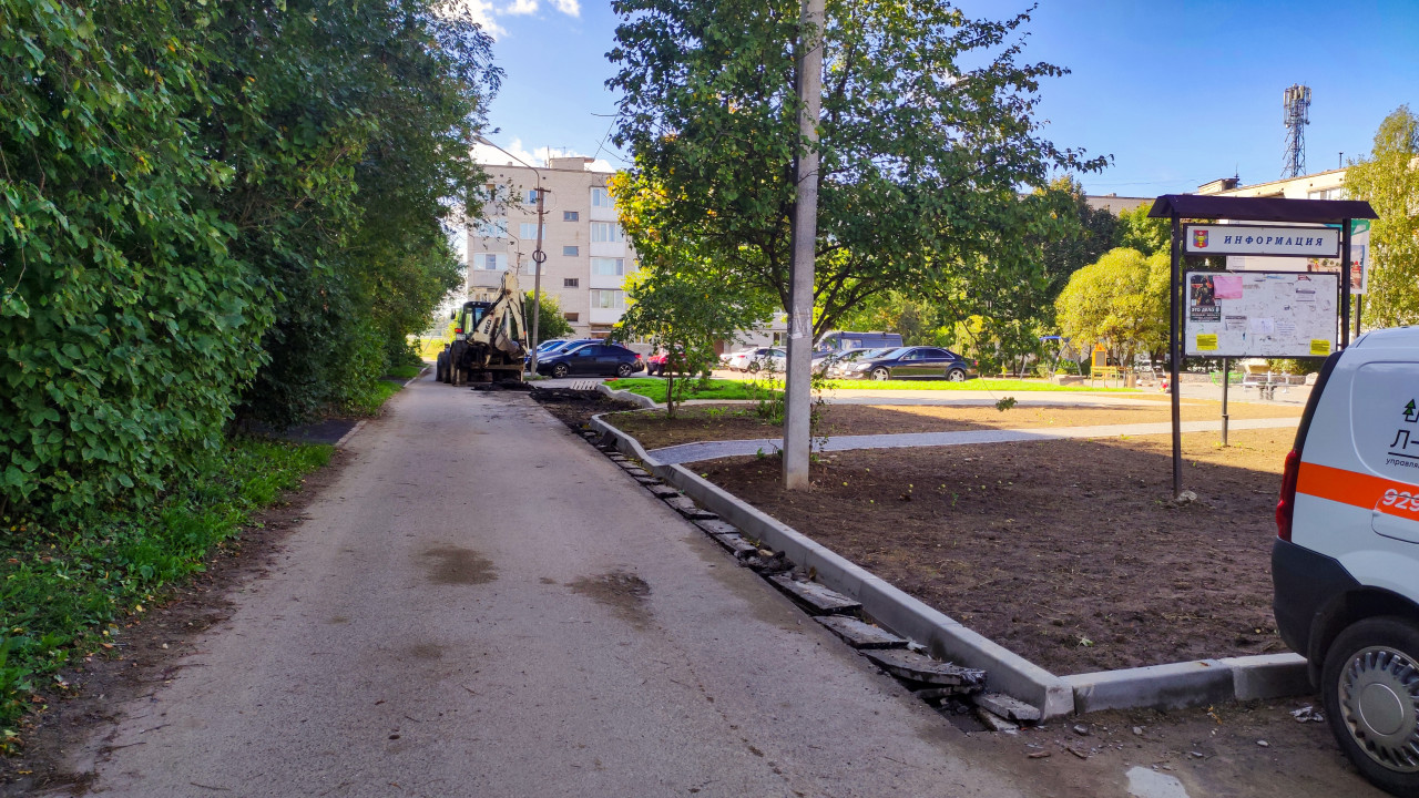 На фото показан участок дворового проезда, где ведутся дорожные работы: виден экскаватор, установлен бордюр, рядом припаркованы автомобили. В кадре также заметен информационный стенд с объявлениями и автомобиль службы благоустройства. Сцена типична для городских ремонтов и демонстрирует процесс обновления придомовой инфраструктуры. Снимок может использоваться в иллюстрациях к публикациям о дорожных ремонтах, благоустройстве и городском хозяйстве.