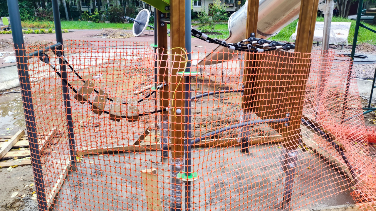Детская площадка с ограждением из сигнальной сетки на этапе строительства