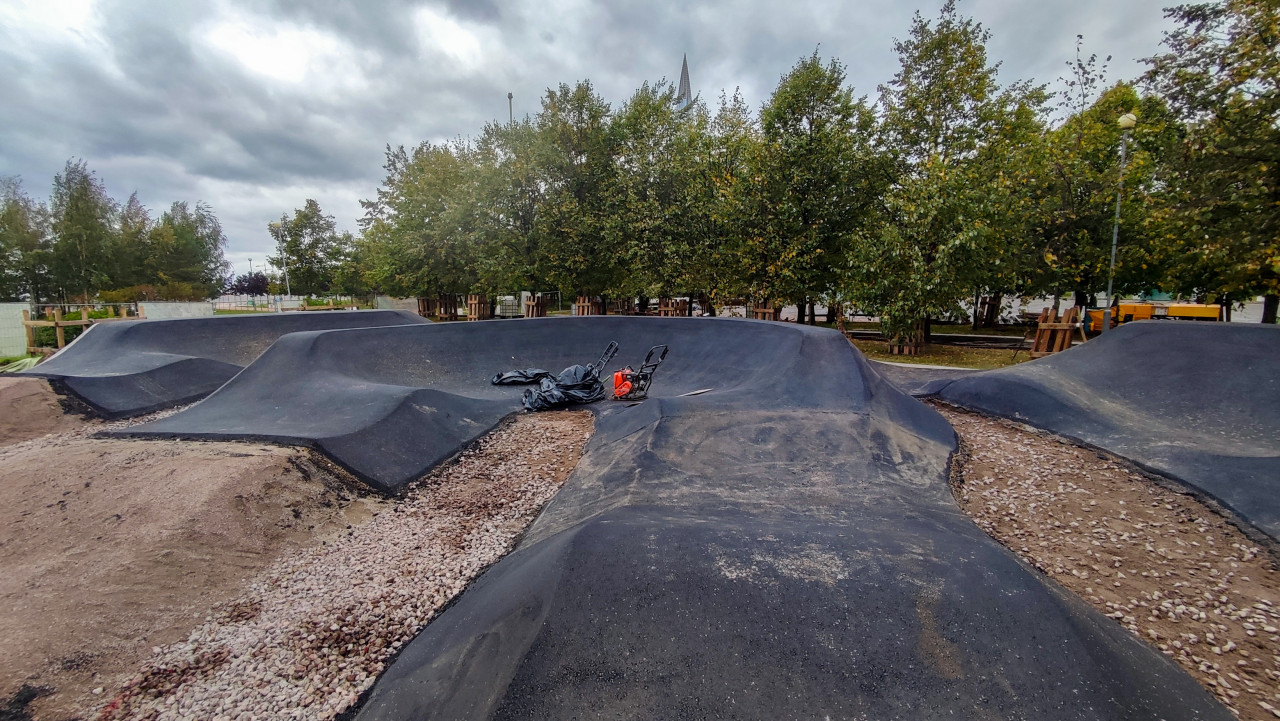 На фотографии показан участок памп-трека — асфальтовой трассы для велосипедов и самокатов, находящийся в стадии строительства. Поверхность трека выполнена из черного асфальта с характерными волнистыми формами, обеспечивающими динамичное катание. В центре кадра заметны рабочие инструменты и строительные материалы, указывающие на незавершенность объекта. На заднем плане — зеленые деревья и ограждение строительной зоны. Съемка проведена в дневное время под пасмурным небом, что создает равномерное рассеянное освещение. Фотография подходит для использования в публикациях о благоустройстве городской среды, строительстве спортивных объектов, а также в материалах о развитии активного отдыха и урбанистике.