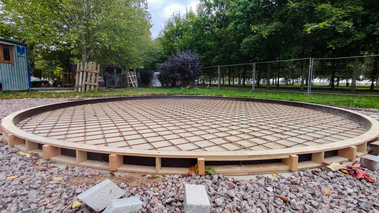 Снимок демонстрирует процесс подготовки круглого бетонного основания с установленной опалубкой и металлической арматурной сеткой. Площадка расположена на участке благоустройства, вокруг видны деревья и строительный забор. Подобная конструкция применяется при устройстве малых архитектурных форм или оснований под декоративные или технические сооружения. Фото подходит для иллюстрации технологий бетонных работ, инженерного проектирования и строительного надзора.