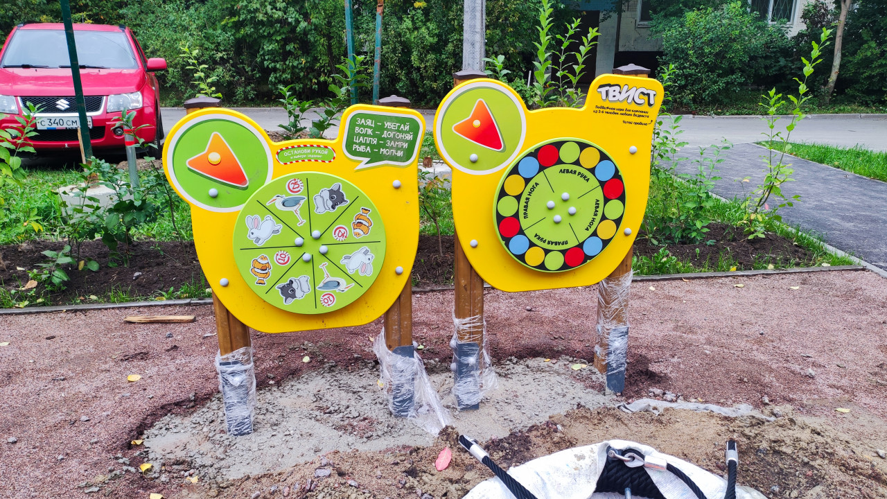 На фотографии изображены две яркие игровые панели из пластика, установленные на детской площадке в жилом дворе. На первой панели размещены изображения животных — зайца, волка, цапли, рыбы и других персонажей, а также текст с правилами игры. На второй панели установлен круговой диск с цветными секторами, обозначающими части тела, как в игре «Твист». Конструкции закреплены на деревянных опорах, их нижние части ещё обёрнуты защитной плёнкой, что говорит о недавнем монтаже. На заднем плане виден красный автомобиль и зелёные кустарники. Фото может использоваться для иллюстрации благоустройства дворов, игровых зон и тем детской активности.