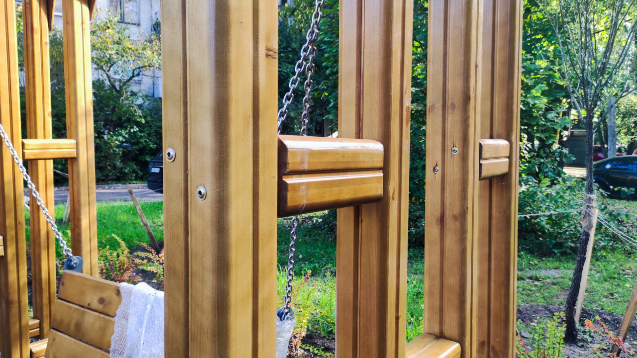 На фото крупным планом видна часть деревянной конструкции с металлическим креплением и подвесной цепью, являющаяся элементом качелей или перголы. Детали выполнены из лакированного клеёного бруса и соединены болтами. На фоне — зелёные насаждения и участок благоустроенной территории. Изображение можно использовать в тематике проектирования и монтажа малых архитектурных форм, инженерных решений и благоустройства.