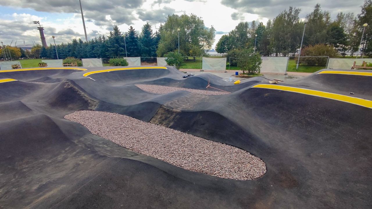 На фотографии запечатлена структура асфальтового памп-трека с плавными волнами, гравийными секциями и нанесенной желтой линией по краю. Этот тип спортивного покрытия создается для катания на велосипедах, самокатах и скейтбордах, обеспечивая разнообразие рельефа и динамику движения. Объект расположен в парковой зоне, вокруг которой видны зеленые насаждения, фонари и ограждения. На поверхности заметны следы строительных работ и оборудование. Снимок иллюстрирует архитектурную форму современного спортивного объекта и этап благоустройства городской среды.