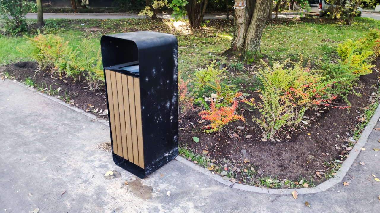 На фотографии показана современная уличная урна из металла и деревянных ламелей, установленная на асфальтовом тротуаре вдоль благоустроенной клумбы. Позади видны деревья, кустарники с осенней листвой и газон. Сцена снята в жилом дворе, типичном для российских городов, где проводится благоустройство в рамках муниципальных программ «Комфортная городская среда». Урна закреплена на бетонном основании, рядом чистый тротуар и ухоженные насаждения. Фото подходит для иллюстрации тем, связанных с благоустройством, городским дизайном и экологией городской среды.